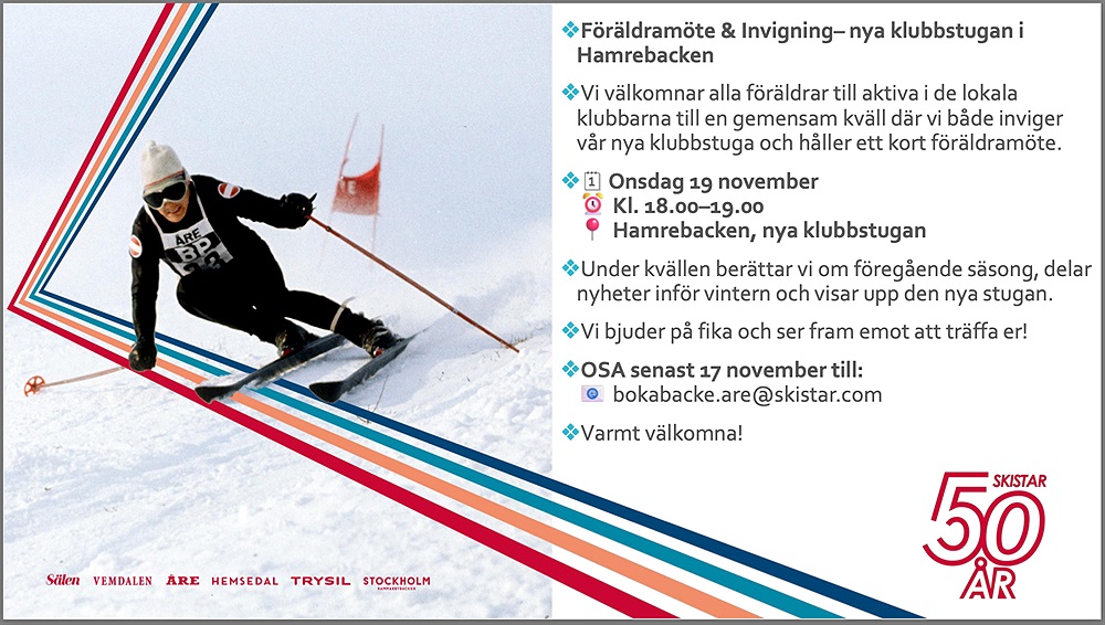 Skistar välkomnar alla föräldrar till aktiva i de lokala klubbarna till en gemensam kväll där vi både inviger vår nya klubbstuga och håller ett kort föräldramöte.